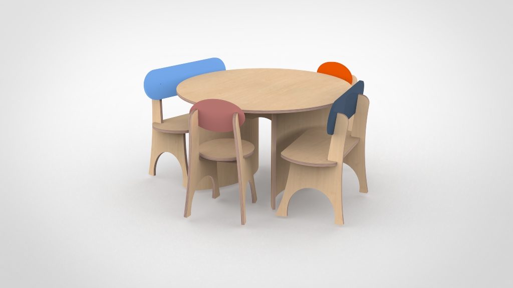 Bij de kindersetjes kun je kiezen uit een ronde of langwerpige tafel. Tevens wordt de hoogte van de tafel aangepast op de hoogte van de kinderstoel en kinderbank. Het tafelblad is standaard in wit afgewerkt, een andere kleur is ook mogelijk, en staat op vier berken tafelpoten.