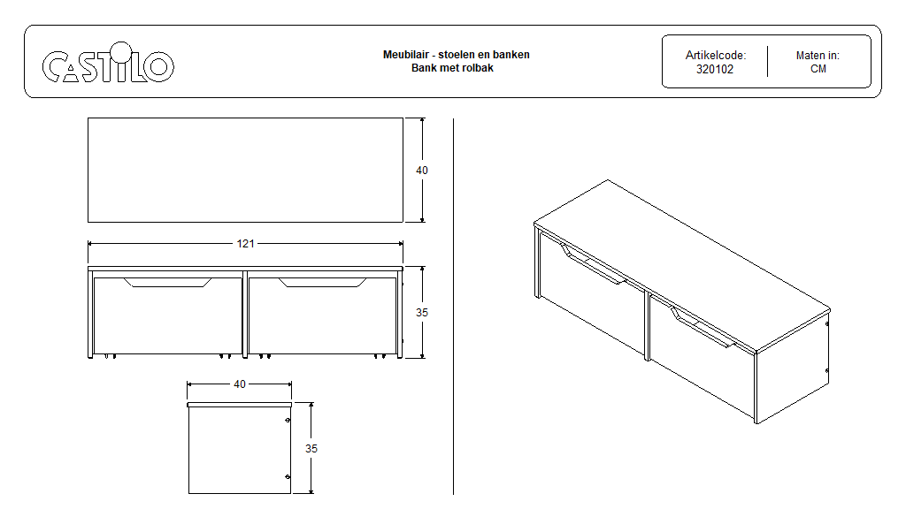 – Bank met rolbakken leverbaar in 60, 120, 180 en 240 cm