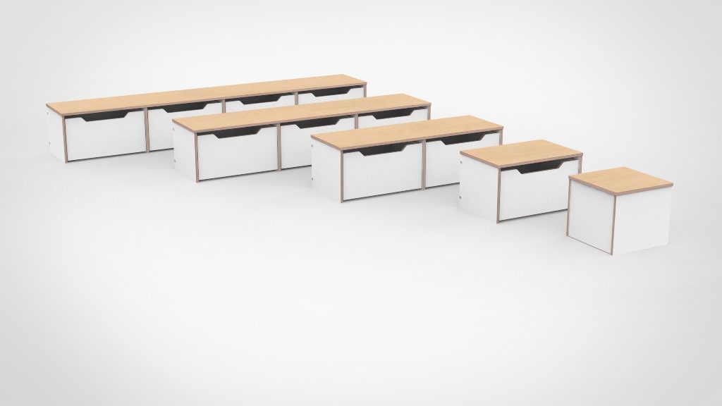 – Bankje met rolbakken kan gecombineerd worden met instructietafels