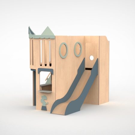 Ruimtewinst is voor Castilo het uitgangspunt geweest om dit model te ontwikkelen, kan heel goed vrij in de ruimte staan. Omdat de trap en glijbaan buitenom lopen biedt de vloer boven de kans voor ongestoord spel. Compri kan met verschillende thema’s worden aangekleed.