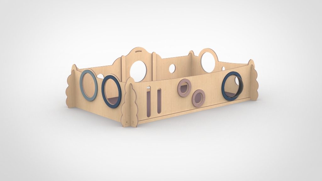 De deurtjes hebben een lage drempel en een hoge vergrendeling en is daardoor voor een volwassenen goed te bedienen. De ronde gaten zijn voorzien van plexiglas. De ondergrond van de grondbox mag gewoon de vloer zijn. De baby kan zich hiertegen het beste afzetten en hierdoor oefenen in allerlei posities, bewegen is namelijk ook leren.