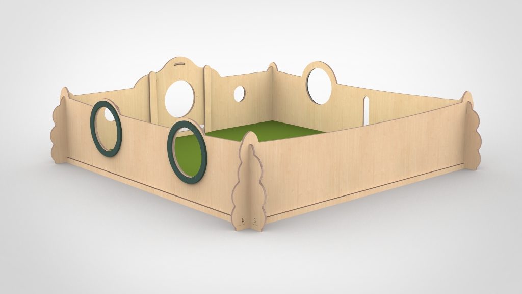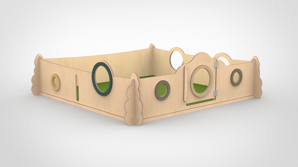 De deurtjes hebben een lage drempel en een hoge vergrendeling en is daardoor voor een volwassenen goed te bedienen. De ronde gaten zijn voorzien van plexiglas. De ondergrond van de grondbox mag gewoon de vloer zijn. De baby kan zich hiertegen het beste afzetten en hierdoor oefenen in allerlei posities, bewegen is namelijk ook leren.