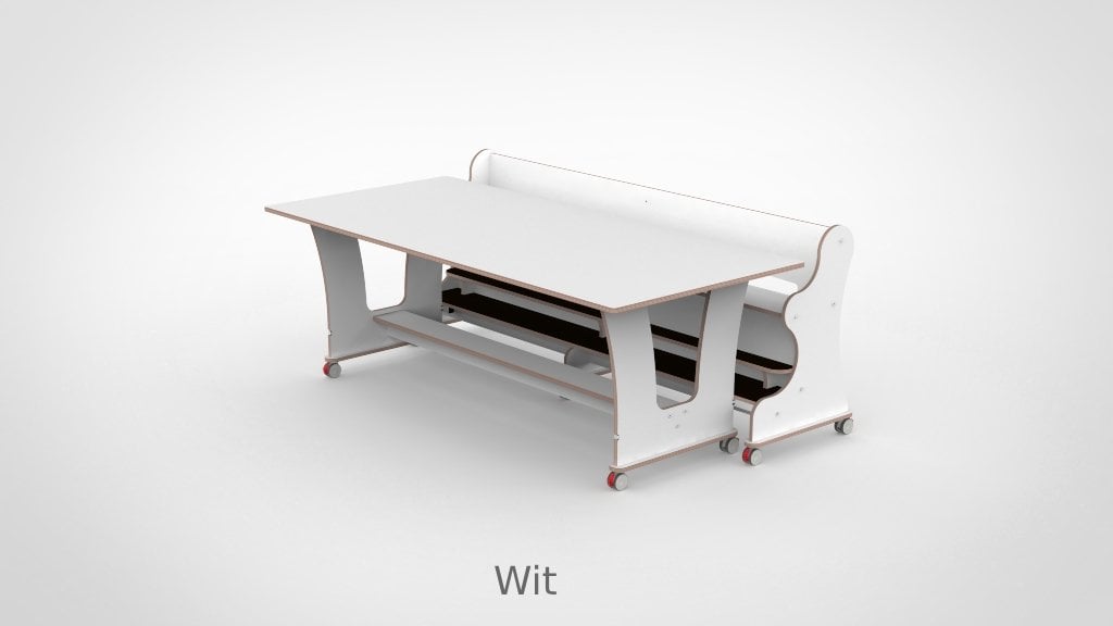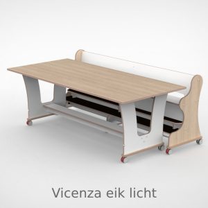 – Bank heeft een breedte van 218,7 cm en een zithoogte van 55 cm. Vanaf de zitting tot hoge voetenplank is de afmeting 22cm de lage voetenplank vanaf zitting is 33cm. – Tafel is L x B x H = 218,7 x 100 x 75 cm. – Bank en tafel zijn met standaard wit HPL toplaag, deze is zeer slijt en krasvast. Zie keuzemenu voor houtdecor. – Standaard geleverd met wit HPL zitting/tafelblad – Onder de bank zijn er 6 zwenkwielen met rem gemonteerd. – Onder de tafel zijn standaard zijn 4 zwenkwielen met rem gemonteerd. – Bij levering tot 1.000,00 incl. btw rekenen wij 55,00 euro bezorgkosten, voor levering op verdieping vragen wij u contact met ons op te nemen. – Voor levering buiten Nederland en de Waddeneilanden, neem dan contact op voor de mogelijkheden.