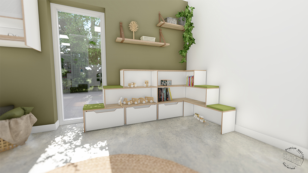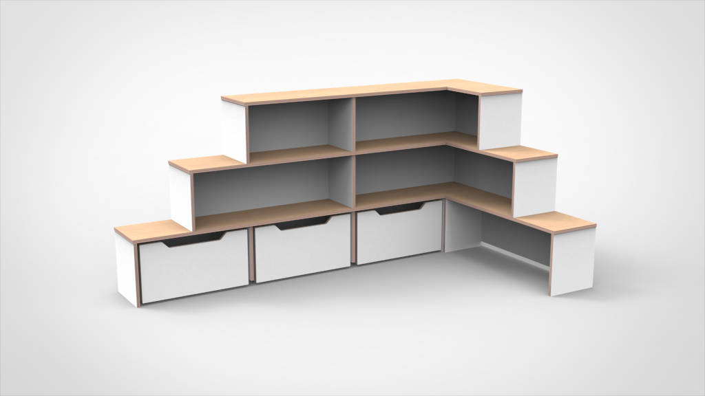 – Standaard wordt het hoekeiland uitgoeverd in  15 mm berken multiplex met aan beide kanten wit HPL.