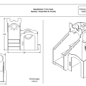 Onze Speedy 3 maakt het spelen compleet. Doordat er aan het glijbaantje een klein speelhuisje vast zit is er voor ieder kind een speelelement. Met de fantasie van een kind wordt dit toestel een genot voor het oog. Ook uit te voeren met de keuze van een klautertrap of standaard trap.