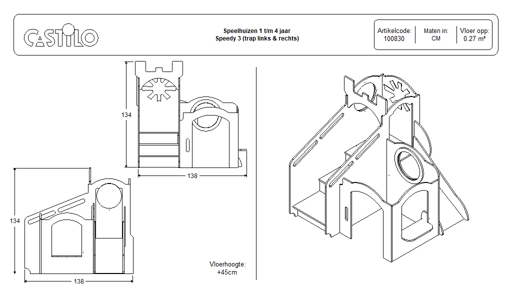 De Castilo speelhuizen worden gemaakt van Berkenmultiplex en afgelakt met verven en lakken op waterbasis, de trappen zijn voorzien van een degelijke leuning die optimaal houvast bieden bij het belopen van de trap zowel naar boven als naar beneden. De traptreden en de vloeren zijn uitgevoerd in Berkenmultiplex met een antisliplaag erop zodat onbedoelde glijpartijen tot een minimum beperkt blijven.