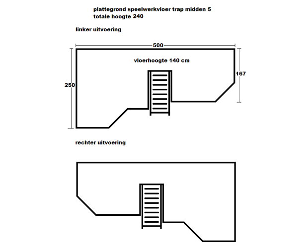 Speelwerkvloeren kunnen op veel manieren worden samengesteld, meestal bepaald het gebruik van de ruimte de plaats van de trap. De trap kan links, rechts of in het midden van de speelwerkvloer staan, op die manier hebben we de voorbeelden ingedeeld om een beter beeld te schetsen. De afgebeelde modellen kunnen zoals getoond besteld worden of kunnen dienen ter inspiratie, misschien zijn de kleuren niet gewenst of is het net even te breed, dan kan dat voor u aangepast worden. Voor een offerte kunt u een model uitkiezen welke het dichtste bij uw wensen komt en de gewenste veranderingen kenbaar maken bij het opmerkingsveld of ons direct telefonisch benaderen.
