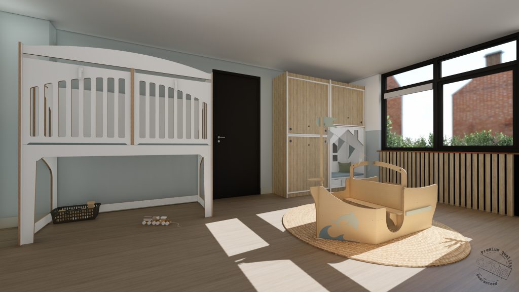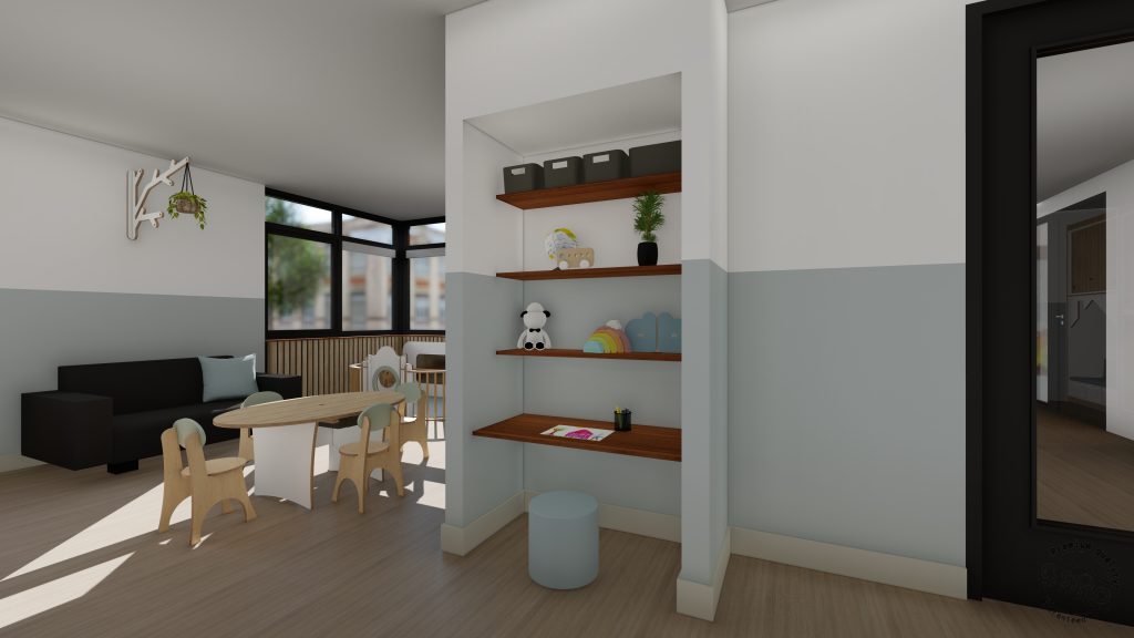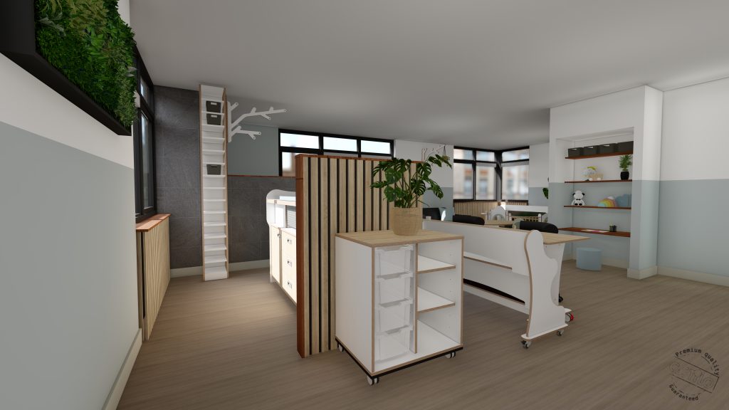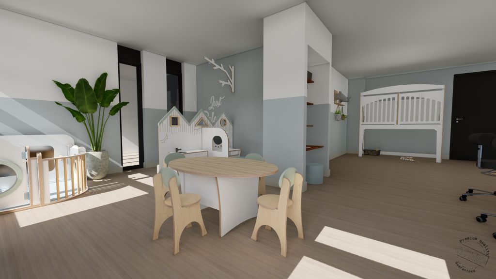 De wensen van het kinderdagverblijf zijn een mooie rustige inrichting, maar wel een beetje stoer. Moodboard Fjord en Chysty sprak ze daarom het meest aan. Ze hebben voor deze inrichting gekozen voor de kleuren grijs, blauw, groen en antraciet. Ook hebben ze gekozen voor mooie lattenwanden en akoestische wandpanelen voor een betere akoestiek in de ruimte.