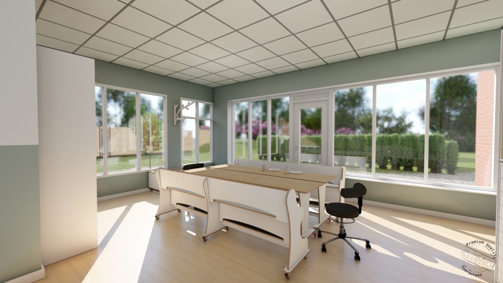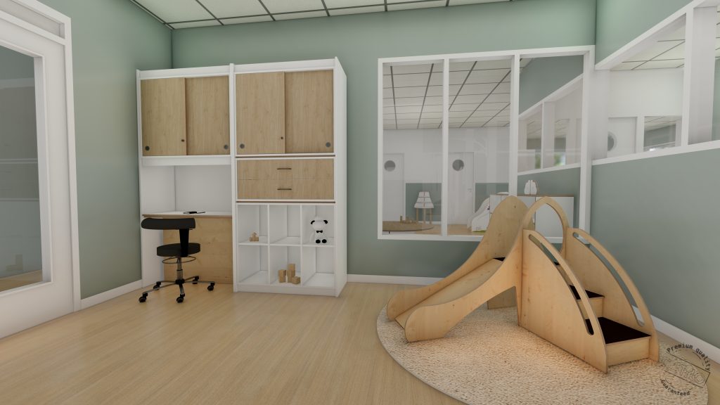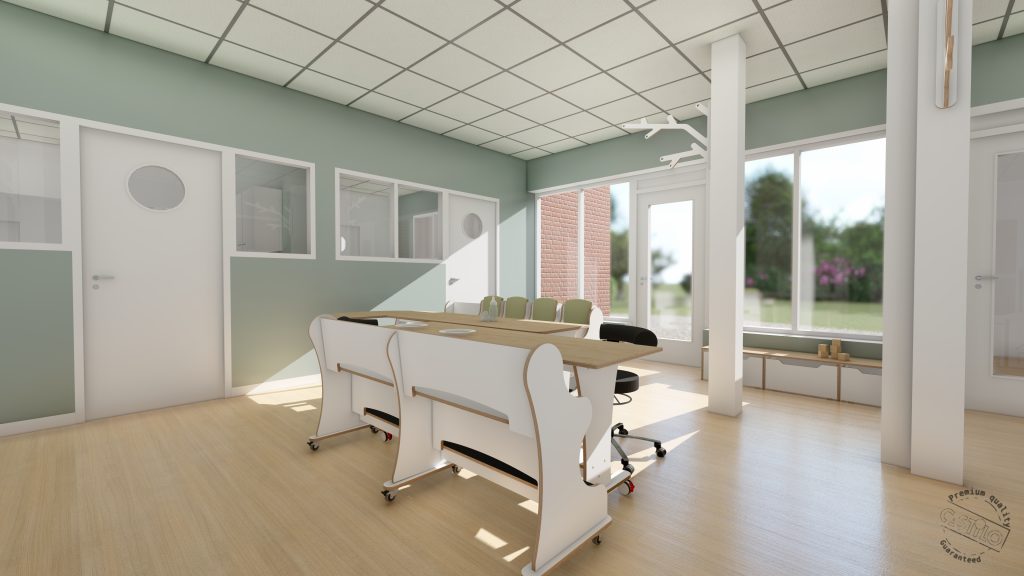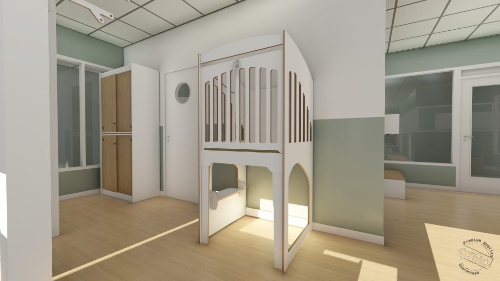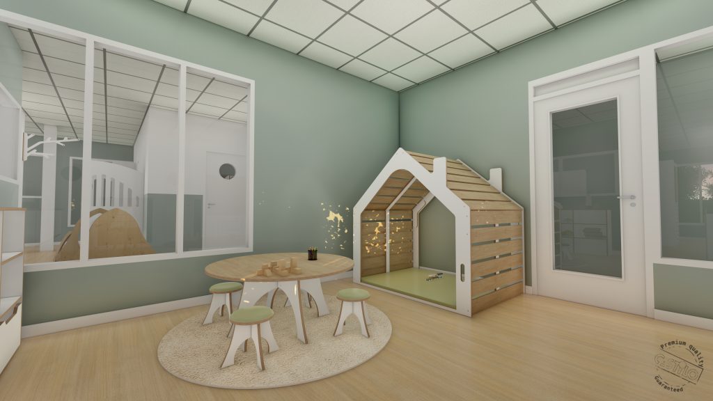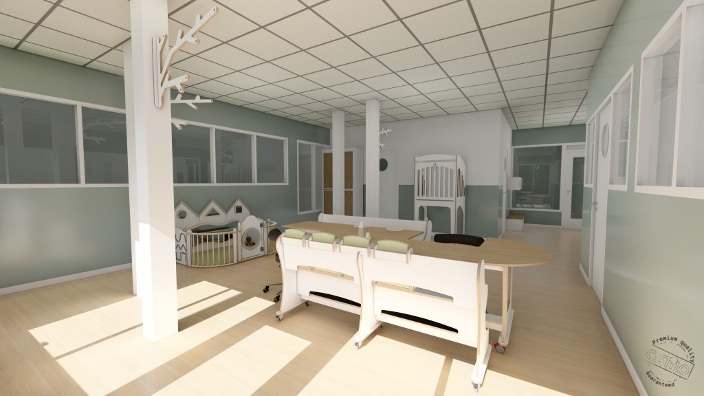 Stap binnen in dit kinderdagverblijf, een speelse en veilige omgeving waar kinderen kunnen ontdekken, leren en groeien. Deze gezellige ruimtes zijn ontworpen om nieuwsgierigheid te stimuleren en avontuur aan te moedigen. Er zijn twee ruimtes een voor de allerkleinste en een voor de peuters. Bij de babygroep is meer rekening gehouden klein en laag meubilair. Bij de peutergroep is iets meer uitdaging met een mooie Lino 5 in het midden van de ruimte.